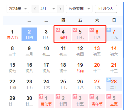 2024年4月4日~4月6日,共3天